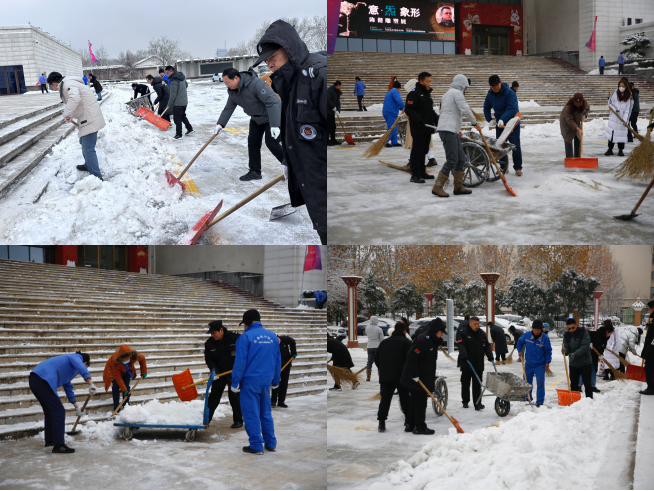 為保障文化館進(jìn)館參觀游客和市民的出行安全、游玩體驗,連心物業(yè)文化館項目部提前研判,備足掃雪工具、融雪劑等物資。“以雪為令,聞雪而動”,及時啟動雨雪天氣應(yīng)急預(yù)案,加強(qiáng)巡查,對易滑易結(jié)冰路段做到雨雪不停留清掃不間斷,夜間加班清掃,清早組織員工再次進(jìn)行除雪破冰。此舉更是得到了省文化館領(lǐng)導(dǎo)的大力支持,領(lǐng)導(dǎo)不僅躬身入局,還帶領(lǐng)著其他人員一起參與其中。大家不懼嚴(yán)寒,頂著凜冽的寒風(fēng),手持鐵鍬和掃帚積極投入到熱火朝天的掃雪活動中,對游客進(jìn)館參觀必經(jīng)的群星廣場、樓梯、四樓平臺等地方的積雪進(jìn)行清掃。盡管鵝毛般的大雪飄個不停,但是大家齊心協(xié)力、默契配合,鏟雪、鏟冰、裝車、清運、清掃一氣呵成,忙碌——成為風(fēng)雪中最靚麗的風(fēng)景線。你一鐵鍬我一掃帚,全力以赴、甩開膀子加油干,為前來參觀的游客掃出一條“平安路”。寒冷的天氣并沒有影響大家保障游客參觀安全的決心,但更加堅定了文化館項目部對“1+1=1”的服務(wù)理念的堅守。