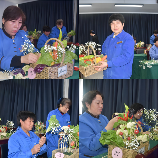 活動現(xiàn)場氣氛熱烈,女職工們紛紛展示出自己的巧手和創(chuàng)意。她們用各種蔬菜和花卉精心制作出一個個美麗的花藝作品,每一件作品都充滿了女性的柔美和細膩。