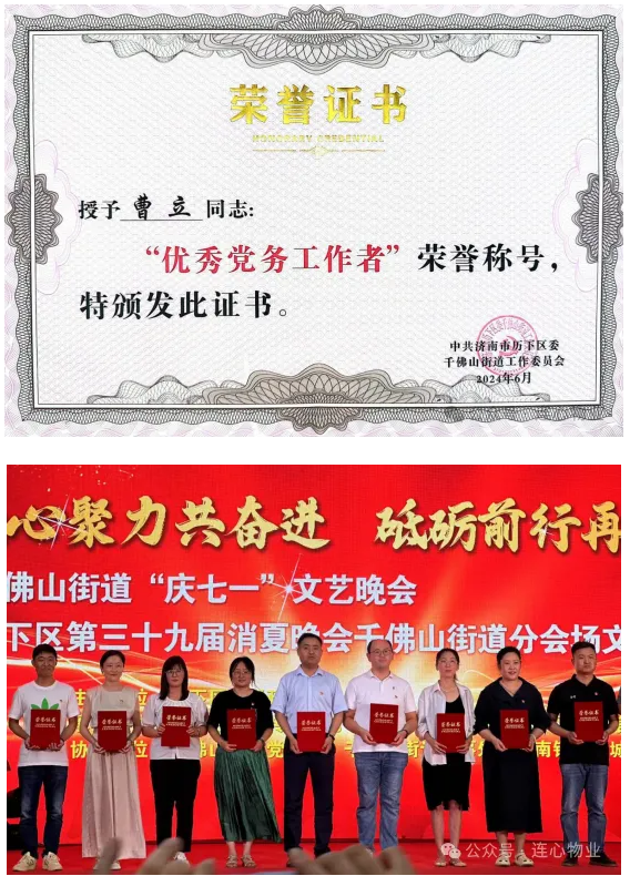 會場文藝匯演中還表彰了街道“優(yōu)秀共產(chǎn)黨員”“優(yōu)秀黨務(wù)工作者”“先進(jìn)基層黨組織”等獲獎?wù)?/span>。濟(jì)南連心物業(yè)有限公司黨支部曹立榮獲千佛山街道“優(yōu)秀黨務(wù)工作者”榮譽(yù)稱號。