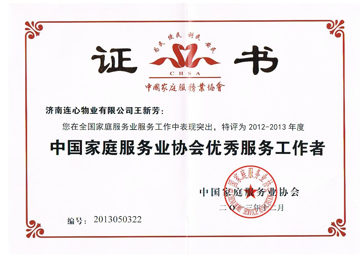 王新芳被評(píng)為2012-2013年度“中國(guó)家庭服務(wù)業(yè)協(xié)會(huì)優(yōu)秀服務(wù)工作者”