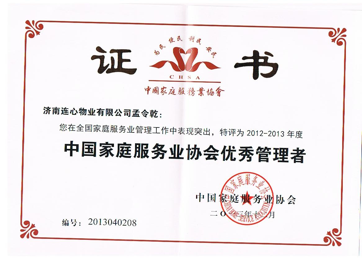 孟令乾被評(píng)為2012-2013年度“中國(guó)家庭服務(wù)業(yè)協(xié)會(huì)優(yōu)秀管理者