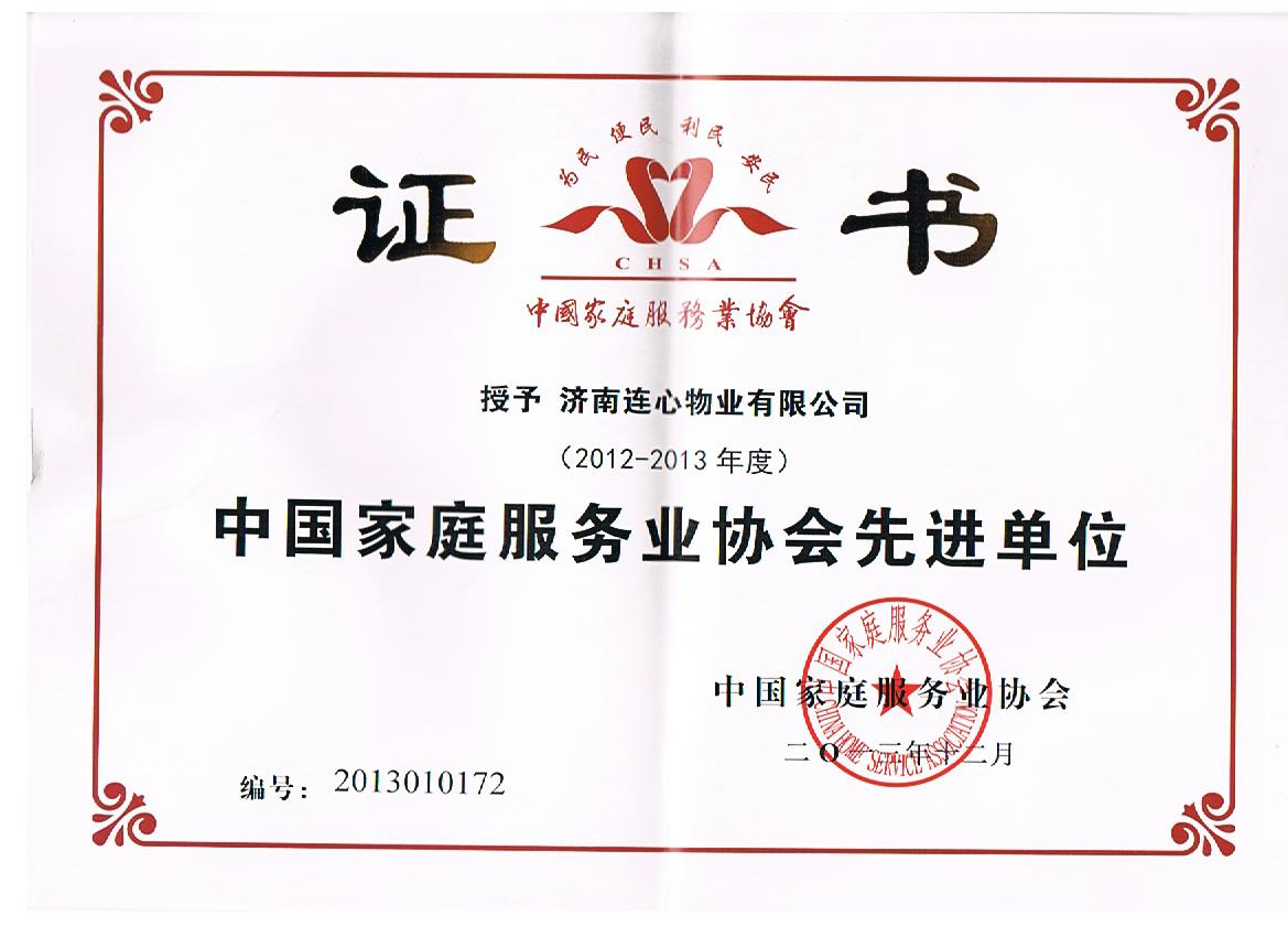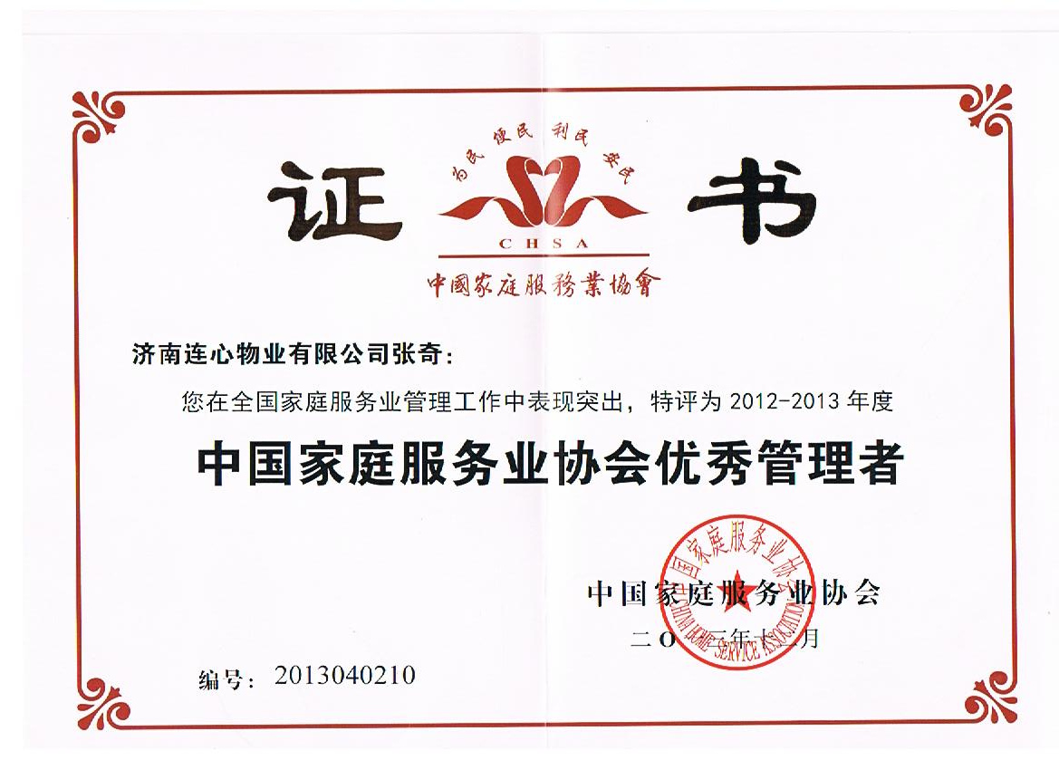 2013年12月在福建省廈門(mén)市召開(kāi)的中國(guó)家庭服務(wù)業(yè)協(xié)會(huì)第四屆會(huì)員代表大會(huì)第四次會(huì)議上濟(jì)南連心物業(yè)有限公司被中國(guó)家庭服務(wù)業(yè)協(xié)會(huì)評(píng)為2012-2013年度“中國(guó)家庭服務(wù)業(yè)協(xié)會(huì)先進(jìn)單位”;孟令乾、曹立、張奇三位同志因在全國(guó)家庭服務(wù)業(yè)管理工作中表現(xiàn)突出,被中國(guó)家庭服務(wù)業(yè)協(xié)會(huì)評(píng)為2012-2013年度“中國(guó)家庭服務(wù)業(yè)協(xié)會(huì)優(yōu)秀管理者”;王新芳、馬寶珍、陳美玲三位同志因在全國(guó)家庭服務(wù)業(yè)服務(wù)工作中表現(xiàn)突出,被中國(guó)家庭服務(wù)業(yè)協(xié)會(huì)評(píng)為2012-2013年度“中國(guó)家庭服務(wù)業(yè)協(xié)會(huì)優(yōu)秀服務(wù)工作者”。