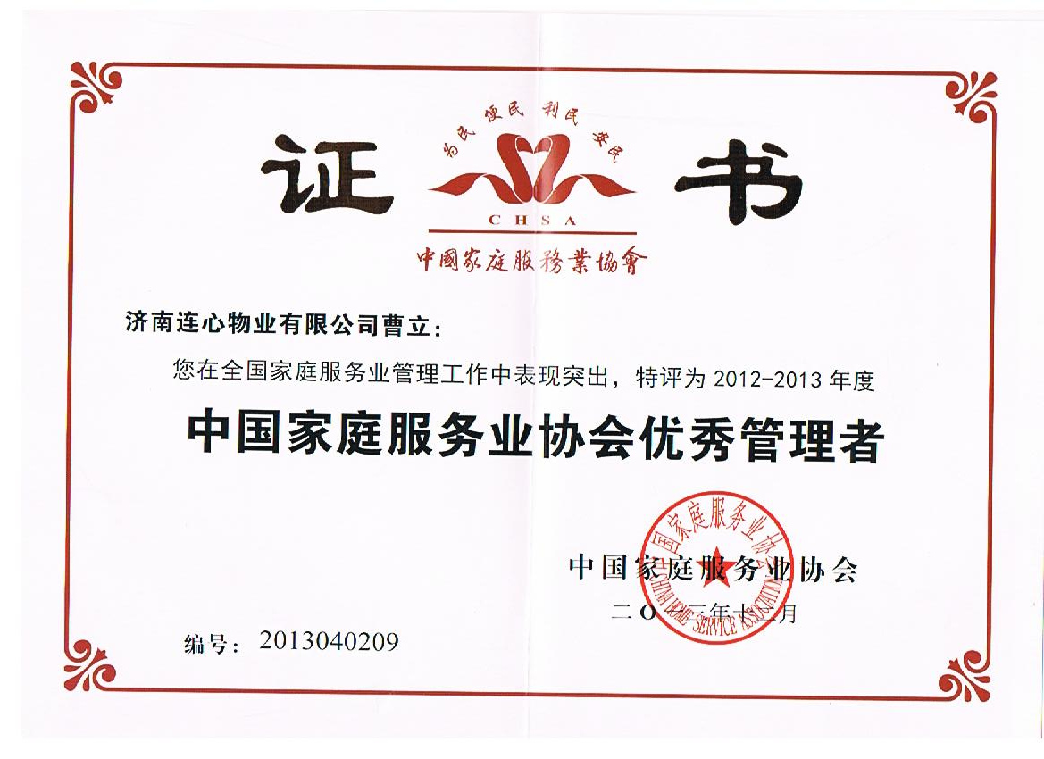 曹立被評(píng)為2012-2013年度“中國(guó)家庭服務(wù)業(yè)協(xié)會(huì)優(yōu)秀管理者”