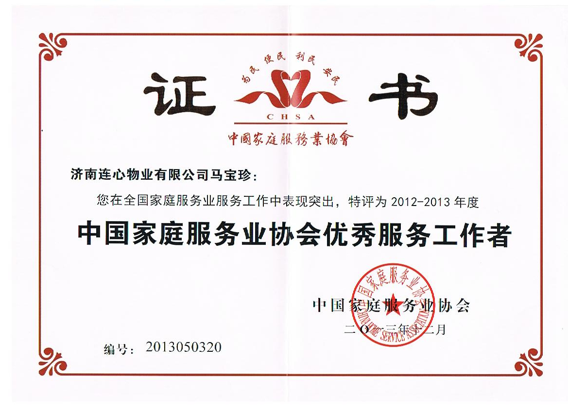 馬寶珍被評(píng)為2012-2013年度“中國(guó)家庭服務(wù)業(yè)協(xié)會(huì)優(yōu)秀服務(wù)工作者”