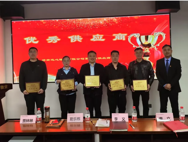 根據(jù)公司優(yōu)秀供應(yīng)商評(píng)選辦法,有五家供應(yīng)商被評(píng)為“濟(jì)南連心物業(yè)2024年度優(yōu)秀供應(yīng)商”,分別是:濟(jì)南勝良貿(mào)易有限公司、濟(jì)南楚潤(rùn)清洗工程有限公司、華海財(cái)產(chǎn)保險(xiǎn)股份有限公司濟(jì)南中心支公司、濟(jì)南綠博園農(nóng)林物資有限公司、濟(jì)南金谷源商貿(mào)有限公司。公司總經(jīng)理曹立為5家優(yōu)秀供應(yīng)商頒發(fā)“優(yōu)秀供應(yīng)商”證書。