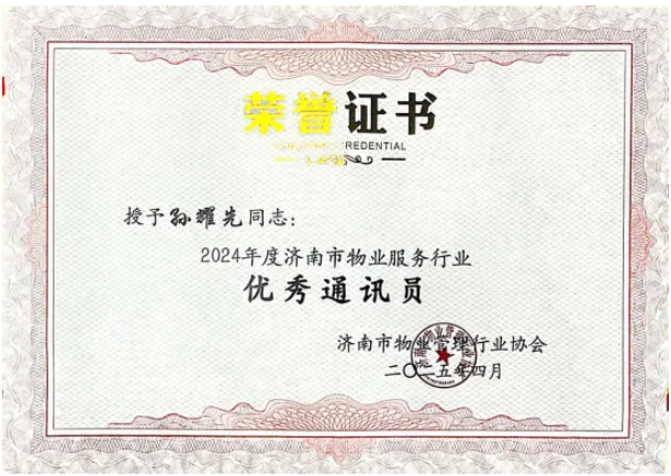 2025年4月25日下午,濟南市物業(yè)管理行業(yè)協(xié)會2024年度通訊員表彰大會在姚家街道姚家社區(qū)黨群服務(wù)中心召開。濟南連心物業(yè)有限公司榮獲“優(yōu)秀宣傳標兵企業(yè)”、孫耀先榮獲“優(yōu)秀通訊員”榮譽稱號。
