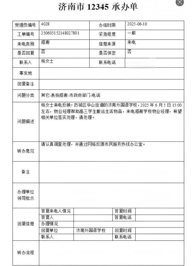 2025年6月5日,濟(jì)南連心物業(yè)有限公司駐濟(jì)南外國語學(xué)校項(xiàng)目收到12345表揚(yáng)電話,市民楊女士通過12345市民熱線,對(duì)濟(jì)南連心物業(yè)公司駐濟(jì)南外國語學(xué)校項(xiàng)目物業(yè)經(jīng)理王金勇表達(dá)誠摯的感謝。