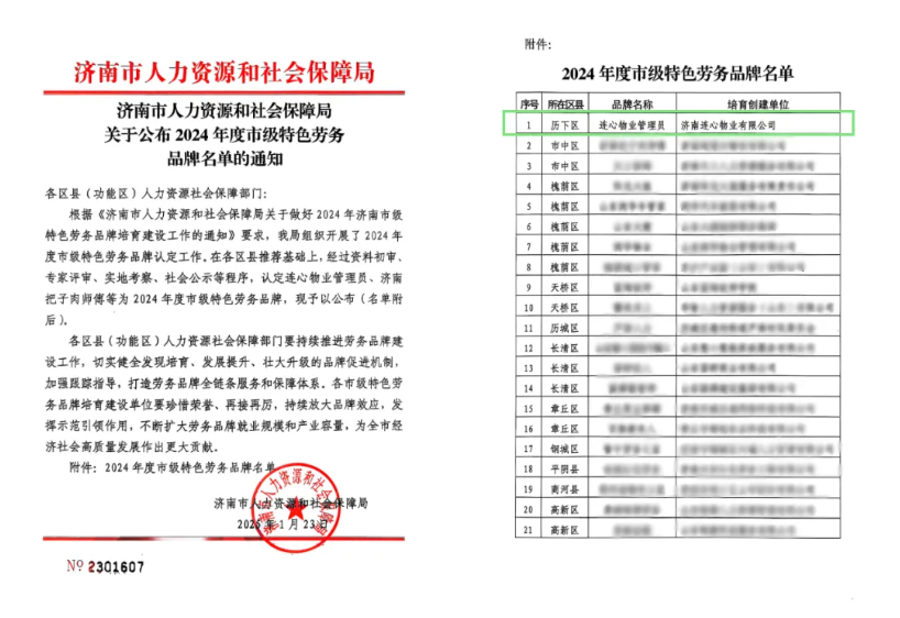 2025年10月20日,濟南市人力資源和社會保障局公布2024年度市級特色勞務(wù)品牌名單,濟南連心物業(yè)有限公司“連心物業(yè)管理員”勞務(wù)品牌獲評2024年度市級特色勞務(wù)品牌,成為濟南市物業(yè)服務(wù)行業(yè)品牌建設(shè)標(biāo)桿。