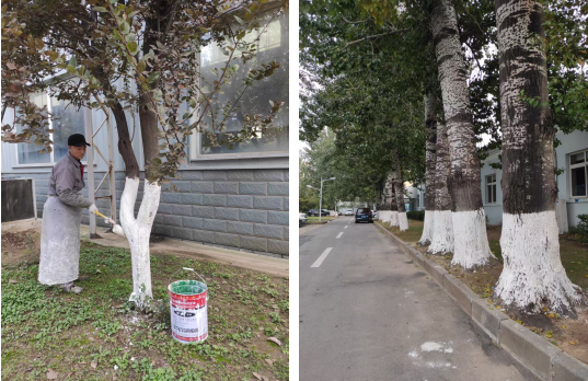 樹木是園區(qū)生態(tài)環(huán)境重要組成部分。為幫助園區(qū)內(nèi)各類喬木、灌木安全越冬,有效防御凍害、日灼(晝夜溫差大導致樹皮開裂)并消滅在樹皮縫隙中越冬的害蟲,項目部組織綠化養(yǎng)護人員,于十一月上旬集中開展為期一周的“樹木涂白”專項行動。 作業(yè)前,對養(yǎng)護人員進行專項培訓,明確涂白劑的科學配比、涂抹高度、均勻度等標準要求。作業(yè)中,工作人員首先對樹干進行清刮處理,去除老皮、蟲卵,然后使用專用工具進行規(guī)范涂刷,確保涂白高度整齊劃一,涂層均勻、光滑、美觀,不留死角。此次行動共完成園區(qū)主干道、辦公樓周邊、綠地內(nèi)共計700余株樹木的涂白工作,不僅為樹木穿上了潔白的“防護服”,也成為冬日園區(qū)一道亮麗風景線。