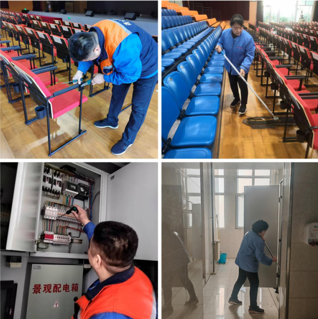 為確保戲劇節(jié)活動(dòng)場(chǎng)地及校園公共區(qū)域環(huán)境整潔有序,項(xiàng)目部提前部署工作。項(xiàng)目保潔團(tuán)隊(duì)對(duì)學(xué)校禮堂進(jìn)行全方位清潔,從座椅縫隙、地面污漬到舞臺(tái)周邊、玻璃門(mén)窗,逐一細(xì)致擦拭、拖掃,不放過(guò)任何衛(wèi)生死角,校園內(nèi)道路、宣傳欄等區(qū)域也同步開(kāi)展深度保潔,保潔人員手持清掃工具對(duì)路面雜物、宣傳欄積塵進(jìn)行徹底清理,讓校園環(huán)境煥然一新。在設(shè)施保障方面,項(xiàng)目維修團(tuán)隊(duì)提前排查電路線(xiàn)路、檢修座椅穩(wěn)固性,對(duì)發(fā)現(xiàn)的細(xì)微故障及時(shí)處理,確保活動(dòng)期間各類(lèi)設(shè)施設(shè)備正常運(yùn)行,從硬件層面為戲劇節(jié)筑牢安全防線(xiàn)。項(xiàng)目會(huì)務(wù)服務(wù)人員全程跟進(jìn)保障工作。提前對(duì)主席臺(tái)進(jìn)行標(biāo)準(zhǔn)化布置,全面消毒清洗并精準(zhǔn)擺放茶具、飲用水等;活動(dòng)期間隨時(shí)待命,及時(shí)響應(yīng)會(huì)場(chǎng)各類(lèi)服務(wù)需求,以貼心、規(guī)范會(huì)務(wù)服務(wù),為活動(dòng)順利開(kāi)展提供有力支撐。