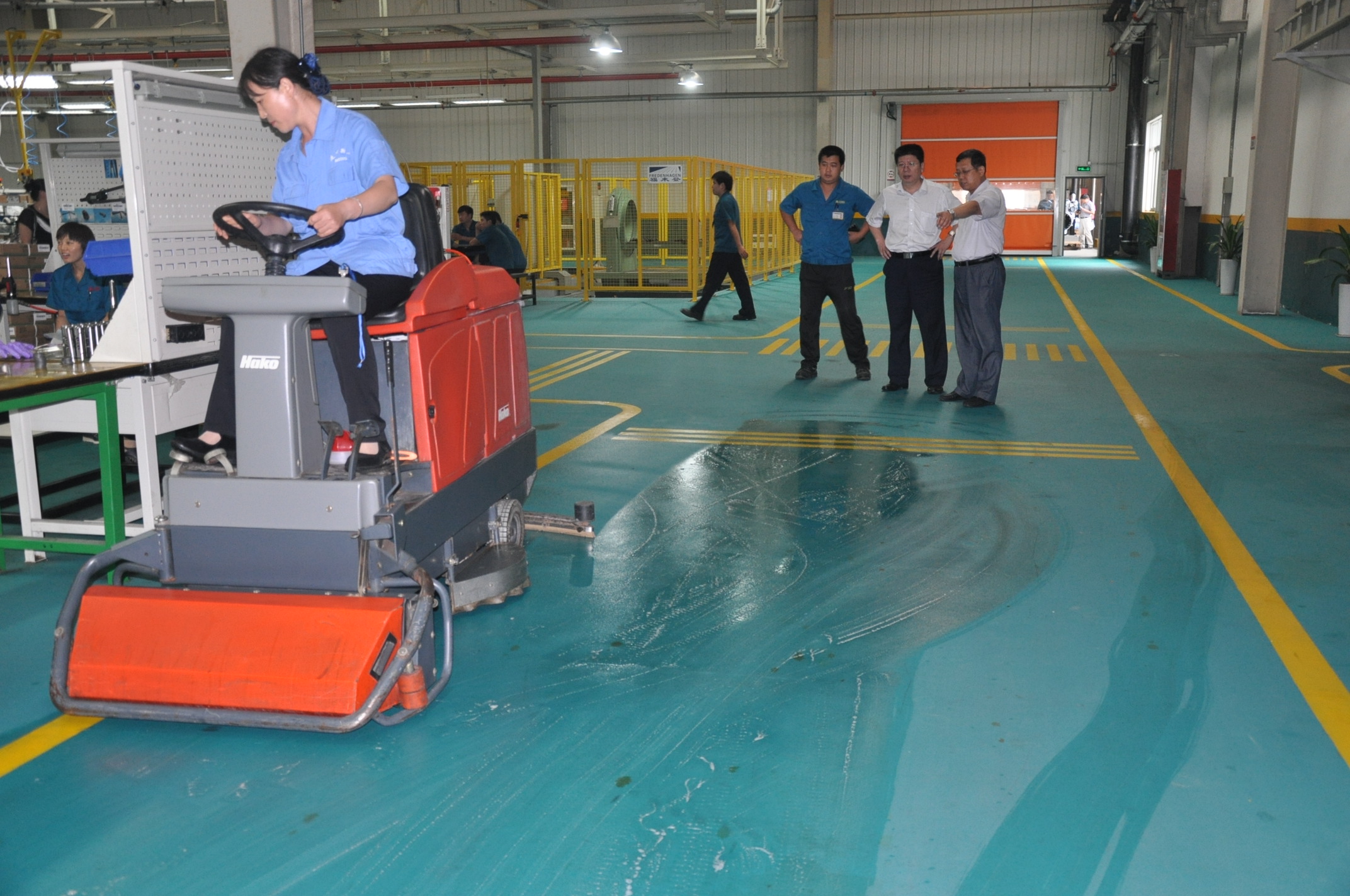 調(diào)研組首先對(duì)公司服務(wù)的重汽動(dòng)力公司進(jìn)行了參觀,看到偌大的車(chē)間內(nèi),保潔人員駕駛德國(guó)哈高B910洗地機(jī)來(lái)回穿梭,身后留下的是潔凈的地面時(shí),調(diào)研人員不禁為之嘆服。在重汽動(dòng)力曼錚亮、光潔的展廳內(nèi),觀看了設(shè)計(jì)精密的發(fā)動(dòng)機(jī);重汽商用車(chē)展廳內(nèi),調(diào)研人員先后登上3.05米高的HOWO車(chē)觀摩,隨后參觀了亞洲第一流水線車(chē)間——商用車(chē)車(chē)間工作流水線,從開(kāi)始的零部件裝配到整車(chē)組裝完畢下線,完整的展示了車(chē)輛的生產(chǎn)過(guò)程。同時(shí)也對(duì)車(chē)間內(nèi)保潔工作的高標(biāo)準(zhǔn)一陣陣贊嘆。