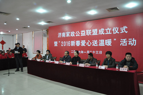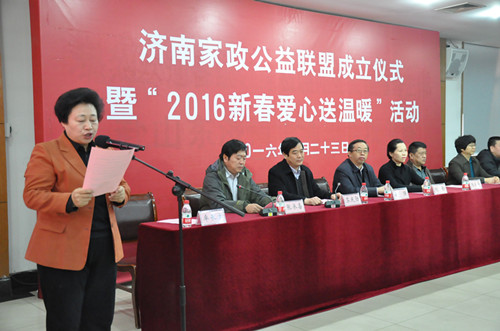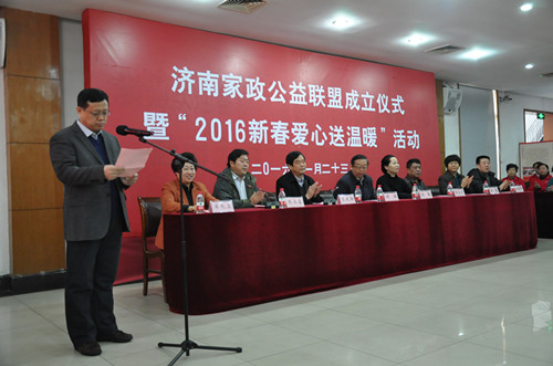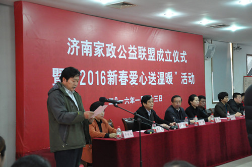 2016年1月23日上午九點(diǎn)三十分,濟(jì)南家政公益聯(lián)盟成立暨“2016年新春愛心送溫暖”活動(dòng)在陽光大姐綜合樓二樓大廳順利召開。濟(jì)南市人大常委會(huì)副主任許強(qiáng)同志、濟(jì)南市婦聯(lián)主席劉勤同志、濟(jì)南市文明辦副主任蘇慶勛同志、濟(jì)南市老齡辦副主任張良華同志、濟(jì)南市商務(wù)局總經(jīng)濟(jì)師張承喜同志、濟(jì)南市婦聯(lián)巡視員徐蓓同志、濟(jì)南市商務(wù)局商貿(mào)服務(wù)處處長(zhǎng)劉明輝同志、濟(jì)南市家庭服務(wù)業(yè)協(xié)會(huì)會(huì)長(zhǎng)卓長(zhǎng)立同志以及濟(jì)南陽光大姐、濟(jì)南連心物業(yè)、濟(jì)南心連心家政等二十余家家政企業(yè)代表員工共同參加。
