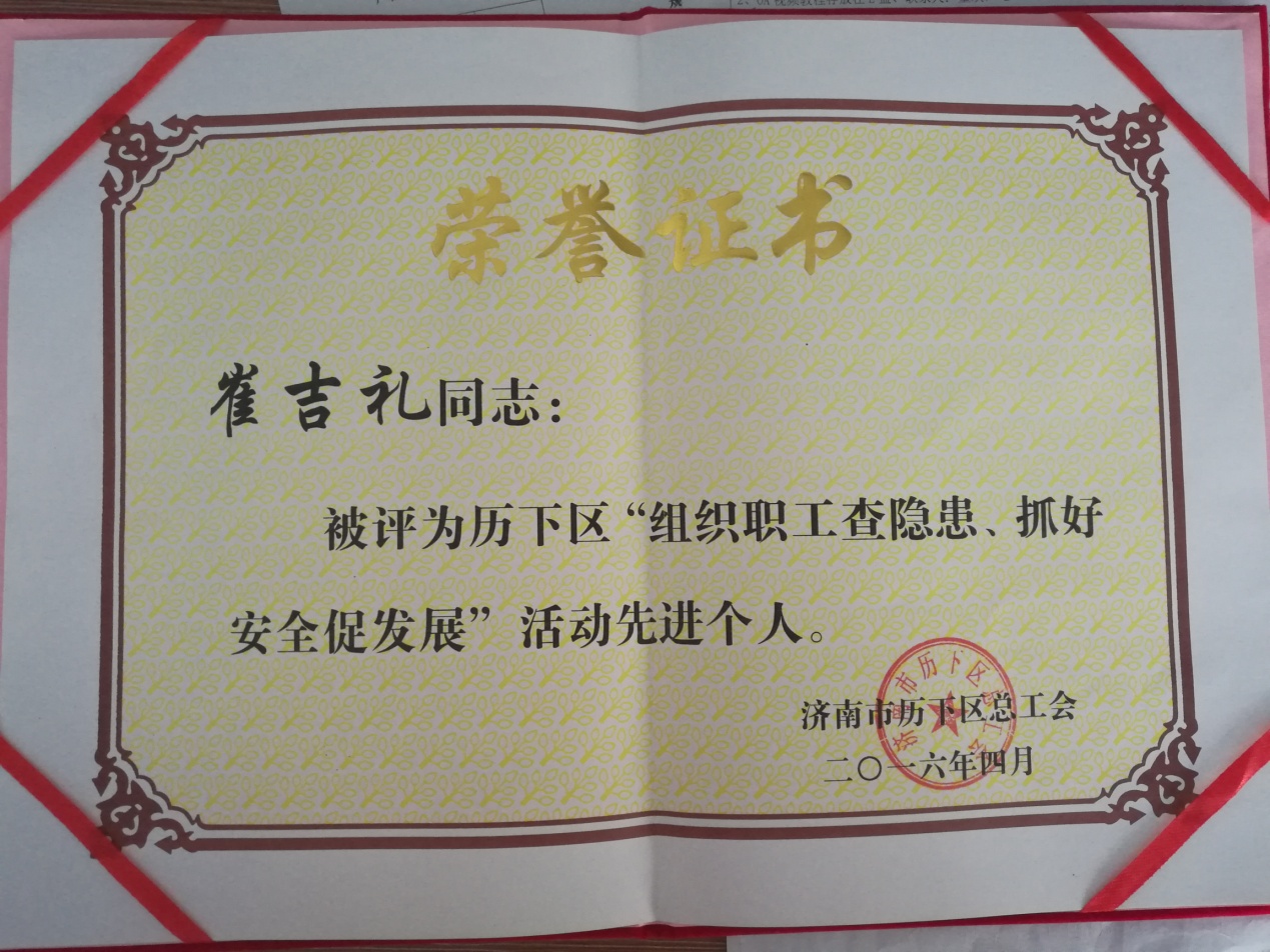 濟(jì)南連心物業(yè)有限公司在2016年度“職工查隱患”活動中榮獲“先進(jìn)單位”稱號。公司員工崔吉禮榮獲“職工查隱患活動先進(jìn)個人”稱號,公司工會主席吳建軍同志代表公司領(lǐng)獎。