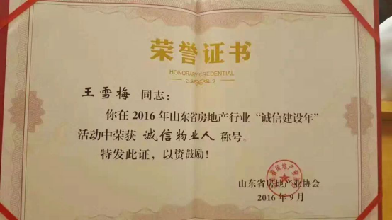 王雪梅同志獲“誠(chéng)信物業(yè)人”稱號(hào)