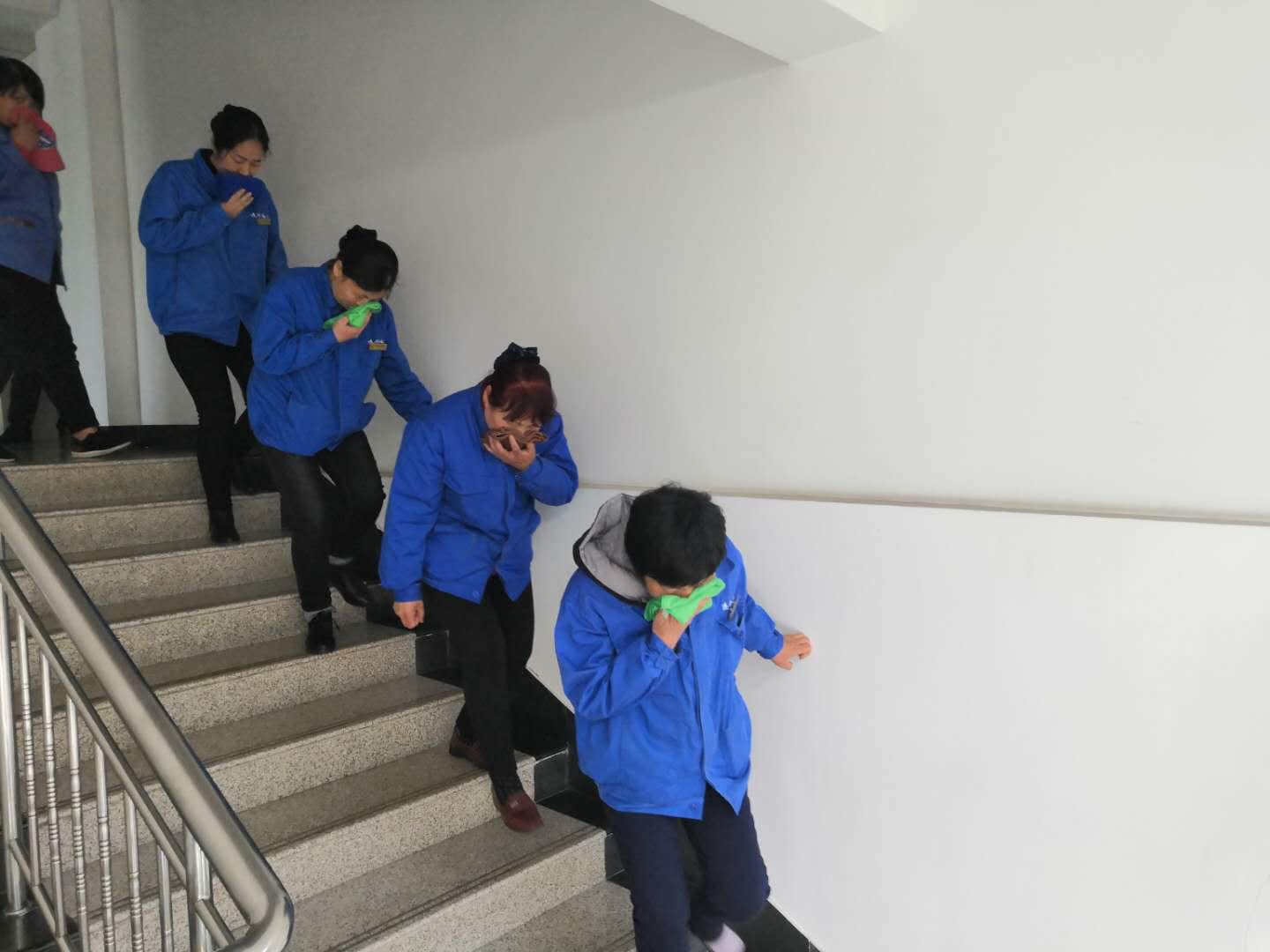 10:10分,消防演習(xí)實(shí)戰(zhàn)開(kāi)始。由消防總指揮模擬手動(dòng)報(bào)警,消防值班室接警后,巡邏人員王生明攜帶對(duì)講機(jī)及滅火器趕赴現(xiàn)場(chǎng)確定火警,并立即上報(bào)消防演習(xí)總指揮,請(qǐng)示啟動(dòng)消防火警應(yīng)急預(yù)案。隨著總指揮“啟動(dòng)”命令,火警應(yīng)急預(yù)案立即執(zhí)行:一人迅速撥打火警119,說(shuō)清著火地點(diǎn),火勢(shì)大小,燃燒物質(zhì)和報(bào)警人姓名電話(huà),一人在路口等候消防車(chē)。同時(shí)滅火組,救援組,疏散組,秩序維護(hù)組同時(shí)奔赴著火現(xiàn)場(chǎng),按各自分工,有條不紊進(jìn)行工作。疏散組不停提醒大家不要慌亂,不乘坐電梯,用濕毛巾掩口鼻,彎腰低姿,靠承重墻有序撤離,撤到安全區(qū)域后,清點(diǎn)人數(shù)。