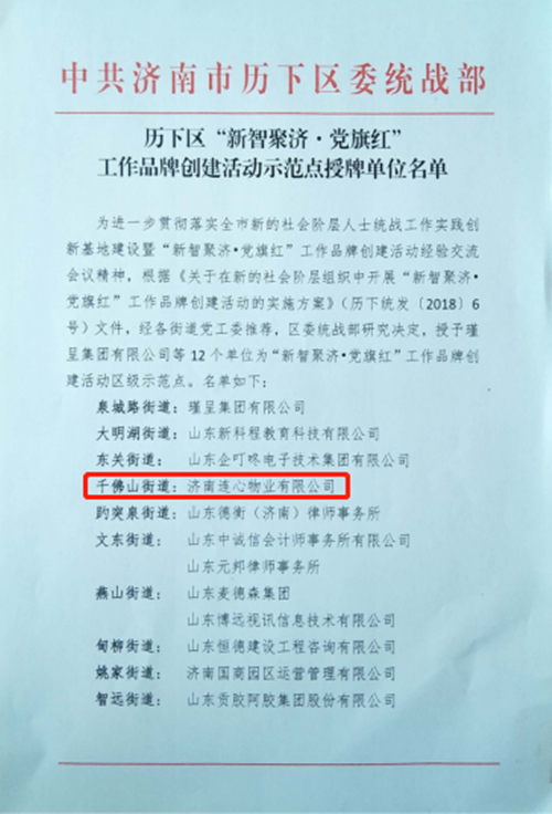 2020年4月30日,濟(jì)南市歷下區(qū)委統(tǒng)戰(zhàn)部“新智聚濟(jì)·黨旗紅”工作品牌創(chuàng)建活動(dòng)示范點(diǎn)授牌儀式在歷下大廈舉行。分別授予濟(jì)南連心物業(yè)有限公司等12家單位為歷下區(qū)“新智聚濟(jì)·黨旗紅”工作品牌創(chuàng)建活動(dòng)區(qū)級(jí)示范點(diǎn)。