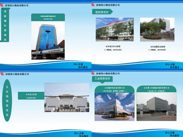 記得2000年7月公司剛成立時,主要以家政服務(wù)為主,那時王宏勇就提出“以質(zhì)量求生存、以效益為生命”的口號,他們依靠良好的服務(wù)質(zhì)量,贏得了廣大客戶的青睞,并逐步站穩(wěn)了腳跟。2001年9月公司接管山東省警官總醫(yī)院的物業(yè)時,全市物業(yè)公司盡銳出戰(zhàn),可謂是物業(yè)服務(wù)行業(yè)的一次“大比武”,經(jīng)過反復(fù)試用、淘汰,最終“連心”公司憑借標(biāo)準(zhǔn)化、規(guī)范化服務(wù)和良好企業(yè)文化一騎絕塵,并一直持續(xù)服務(wù)到現(xiàn)在,為此,醫(yī)院領(lǐng)導(dǎo)特意送出了“選擇‘連心’,就是選擇了放心”的贊譽: