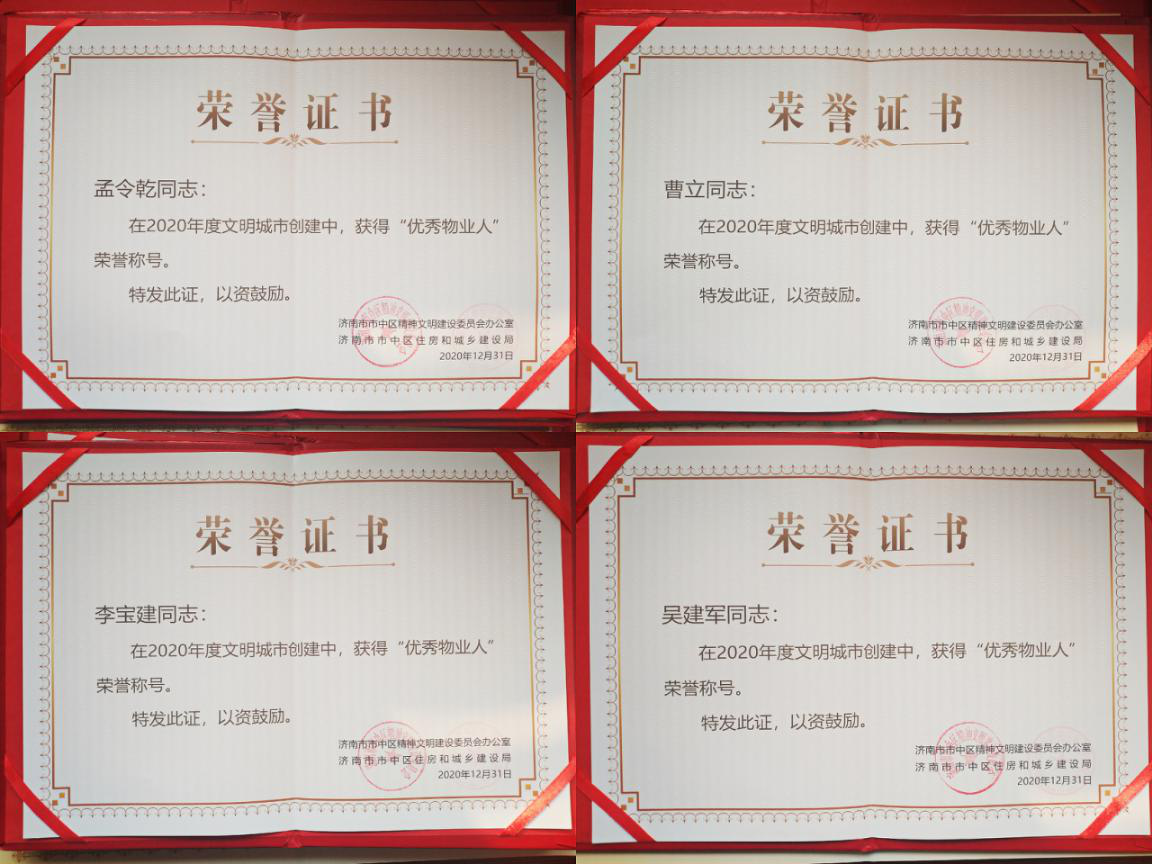 在2020年全國文明城市創(chuàng)建工作中,濟(jì)南連心物業(yè)有限公司緊緊圍繞全國文明城市測(cè)評(píng)指標(biāo)要求,組織有力、成績突出、勇挑重?fù)?dān)、甘于奉獻(xiàn),全身心投入到文明城市創(chuàng)建工作,在平凡的崗位上做出了不平凡的貢獻(xiàn)!榮獲“2020年度文明城市創(chuàng)建先進(jìn)物業(yè)服務(wù)企業(yè)”榮譽(yù)稱號(hào),公司駐山東省警官總醫(yī)院榮獲“2020年度文明城市創(chuàng)建優(yōu)秀物業(yè)管理項(xiàng)目”榮譽(yù)稱號(hào),濟(jì)南連心物業(yè)總經(jīng)理孟令乾、副總經(jīng)理曹立、工會(huì)主席李寶建、項(xiàng)目經(jīng)理吳建軍榮獲“2020年度文明城市創(chuàng)建優(yōu)秀物業(yè)人”榮譽(yù)稱號(hào)。
