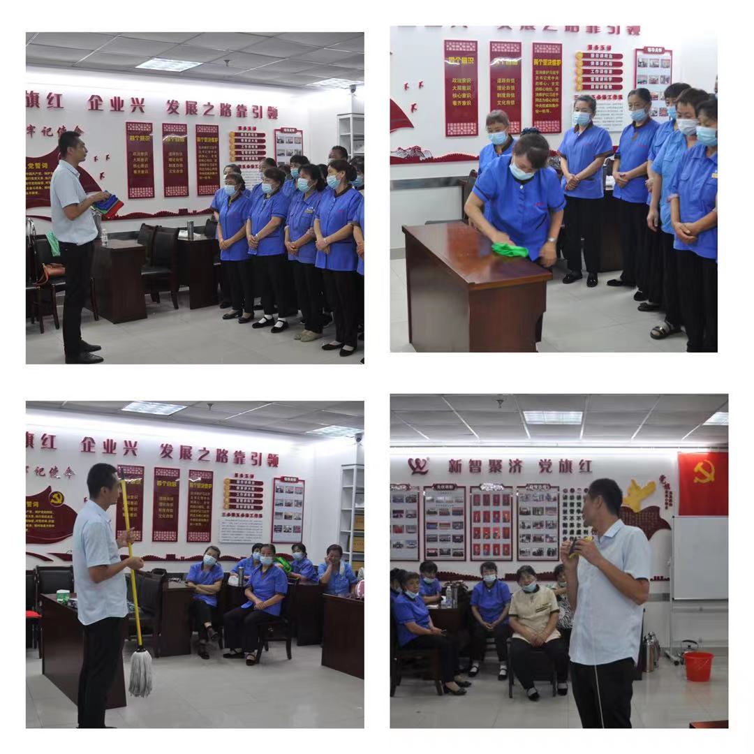 “耳聞不如目見之,目見不如足踐之”,講師張奇帶領(lǐng)學員進行了實操培訓,從抹布顏色的區(qū)分及“一床一巾、一桌一布” 使用、玻璃器的使用方法、吸塵器注意事項等幾方面對學員進行了手把手的實操教學、一對一的演練,讓每一位學員都能上手操作自己不熟練的技能,保證后續(xù)上崗能按照標準使用各類工具,高質(zhì)量完成清潔工作。
