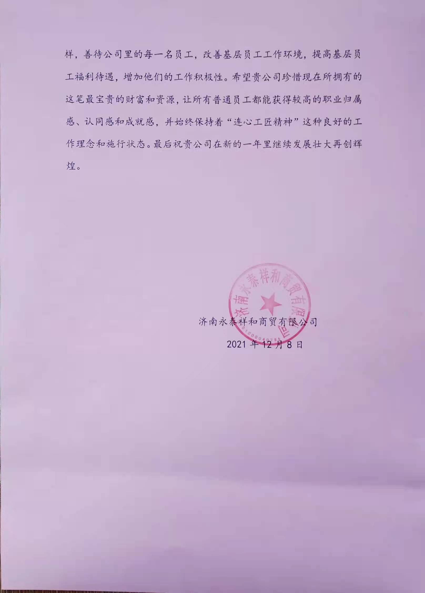 2021年12月8日,濟(jì)南連心物業(yè)有限公司收到一封來自濟(jì)南永泰祥和商貿(mào)有限公司業(yè)主的表?yè)P(yáng)信。信中表?yè)P(yáng)了保潔部朱玉基、高振玲兩位同志認(rèn)真工作、熱情服務(wù)的工作情況,展示了連心物業(yè)基層員工良好精神面貌,踐行著“連心工匠精神”的服務(wù)理念,讓“選擇了連心就選擇了放心”更加深入人心。