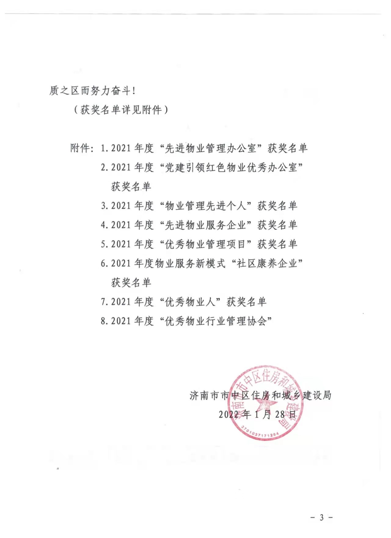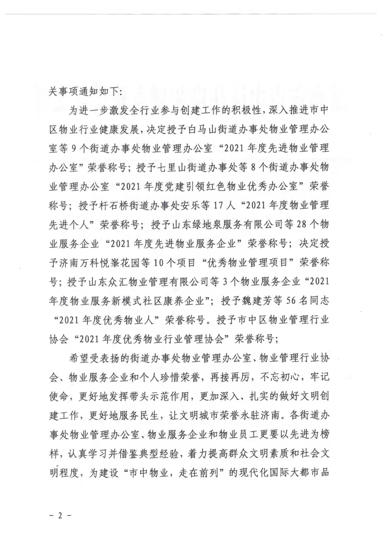 2022年1月,濟(jì)南市市中區(qū)住房和城鄉(xiāng)建設(shè)局表彰了連心物業(yè)陳偉、姜田田在內(nèi)的56名“2021年度優(yōu)秀物業(yè)人”。在2021年全區(qū)文明城市創(chuàng)建、疫情防控、“泉城紅色物業(yè)”工作推進(jìn)以來,在公司總部的領(lǐng)導(dǎo)下,兩名同志緊緊圍繞各項(xiàng)指標(biāo)要求,組織有力、成績突出、勇挑重?fù)?dān)、甘于奉獻(xiàn),全身心投入到各項(xiàng)工作中,在平凡的崗位上做出了不平凡的業(yè)績。